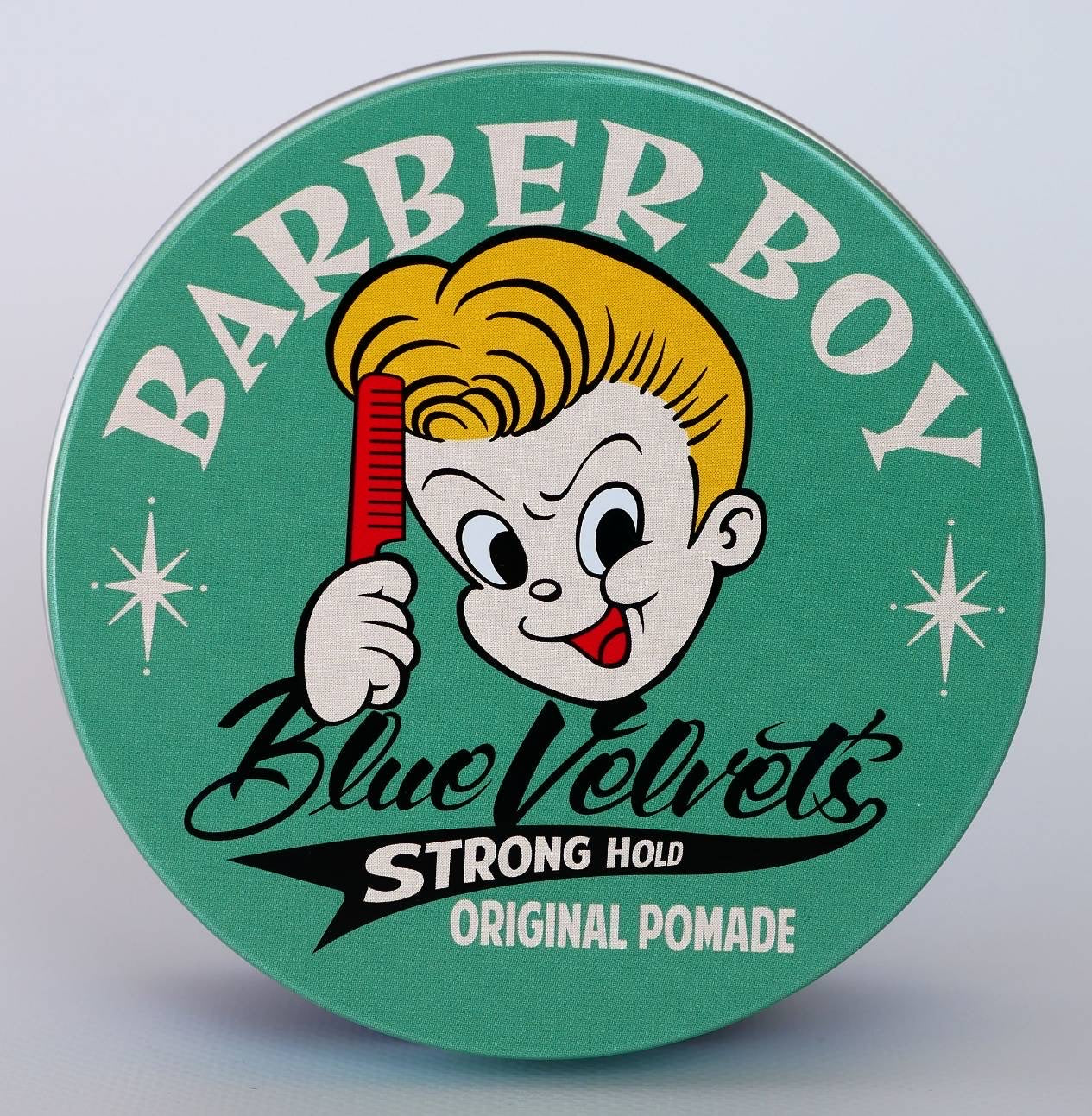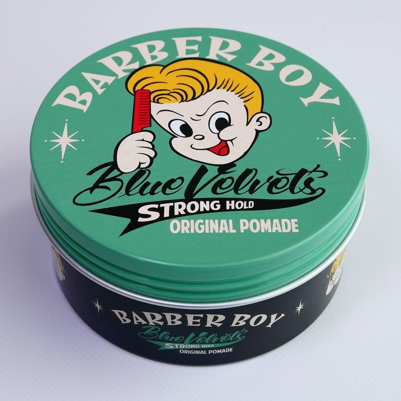 輝くツヤ感、柔らかいテクスチャーながら強力なホールド力を実現した水溶性ポマード。パッケージにはBLUE VELVET'Sのアイコンである『BARBER BOY』を蓋はもちろんサイドにもデザインし、BLUE VELVET'Sの世界観を演出。STRONG HOLDながら水溶性のため簡単に洗い流すことができます。