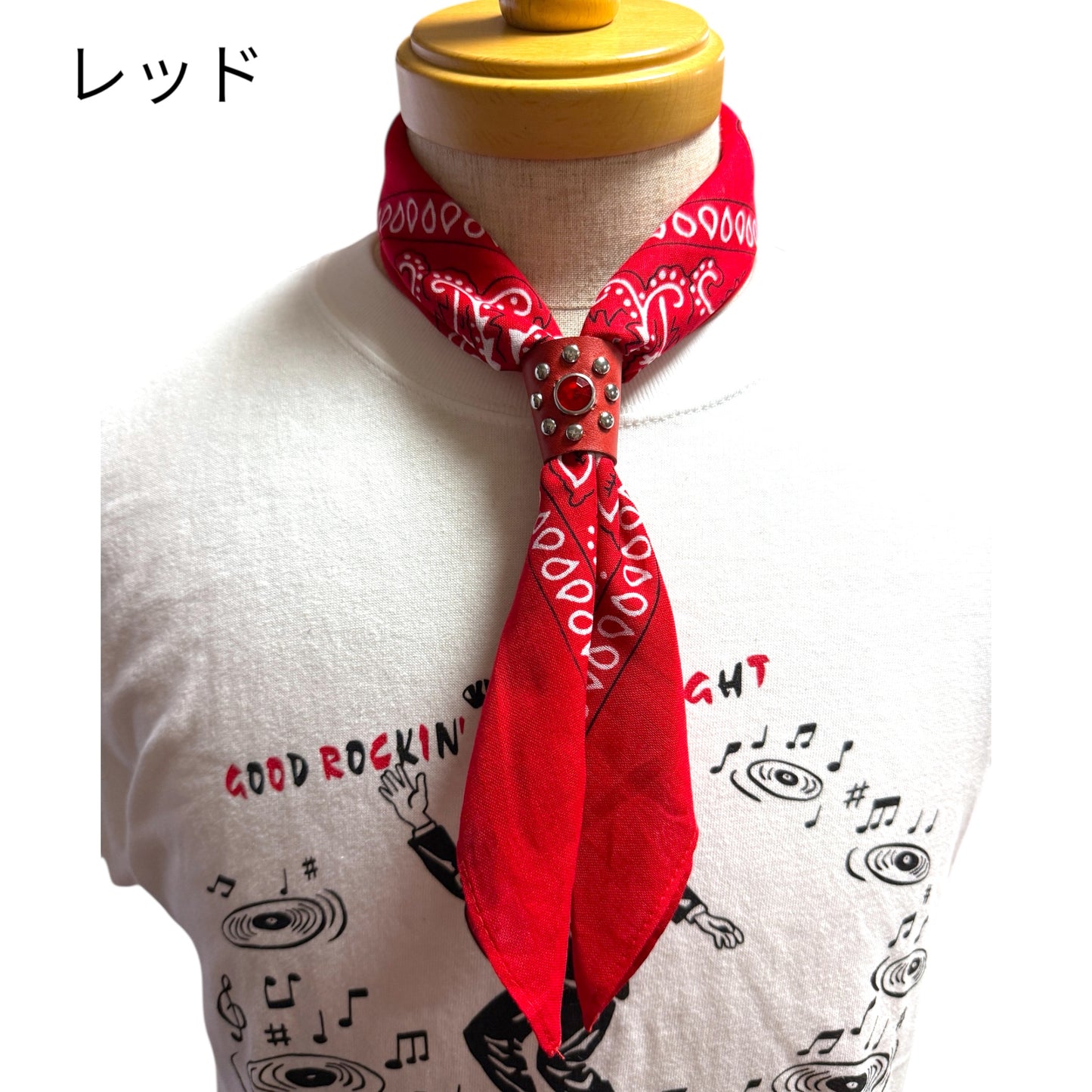 ヴィンテージスタイルの首元を飾るアクセントとして人気のバンダナリングにレザースタッズタイプが加わりました♪バンダナ付きになりますのでカントリー&ウエスタン、ロカビリーファッションを気軽に取り入れ楽しんで頂けます。男女問わずギフトにもお勧めのアイテムです。