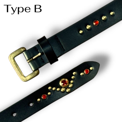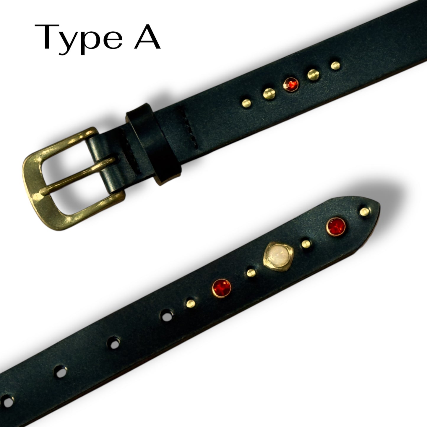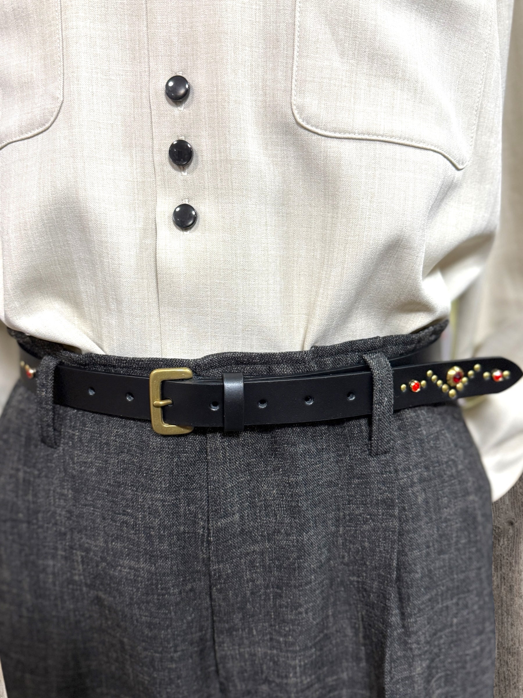 ミッドセンチュリーテイストの物作りに拘り続ける「アメタル」の職人と革職人が一本一本丁寧に作り上げたスペシャルなコラボアイテムです。1930年代から1950年代にかけてウエスタンファッション良く見られたレザースタッズベルト(ジュエルベルト)をよりスマートでシンプルなデザインに落とし込みました。派手さを抑えたデッドストックのジュエルパーツとブラス製スタッズ、落ち着きのあるヴィンテージテイストのブラス製バックル、スタッズが引き立つ艶消しブラックの本革を使用。普段使いはもちろんですが、ヴィンテージスタイルのトラウザーズに合わせドレスアップにも使える大人のスタッズベルトです。ウエストサイズは約76~93.5cm対応可能、デザインはAタイプ、Bタイプの2デザインございます。