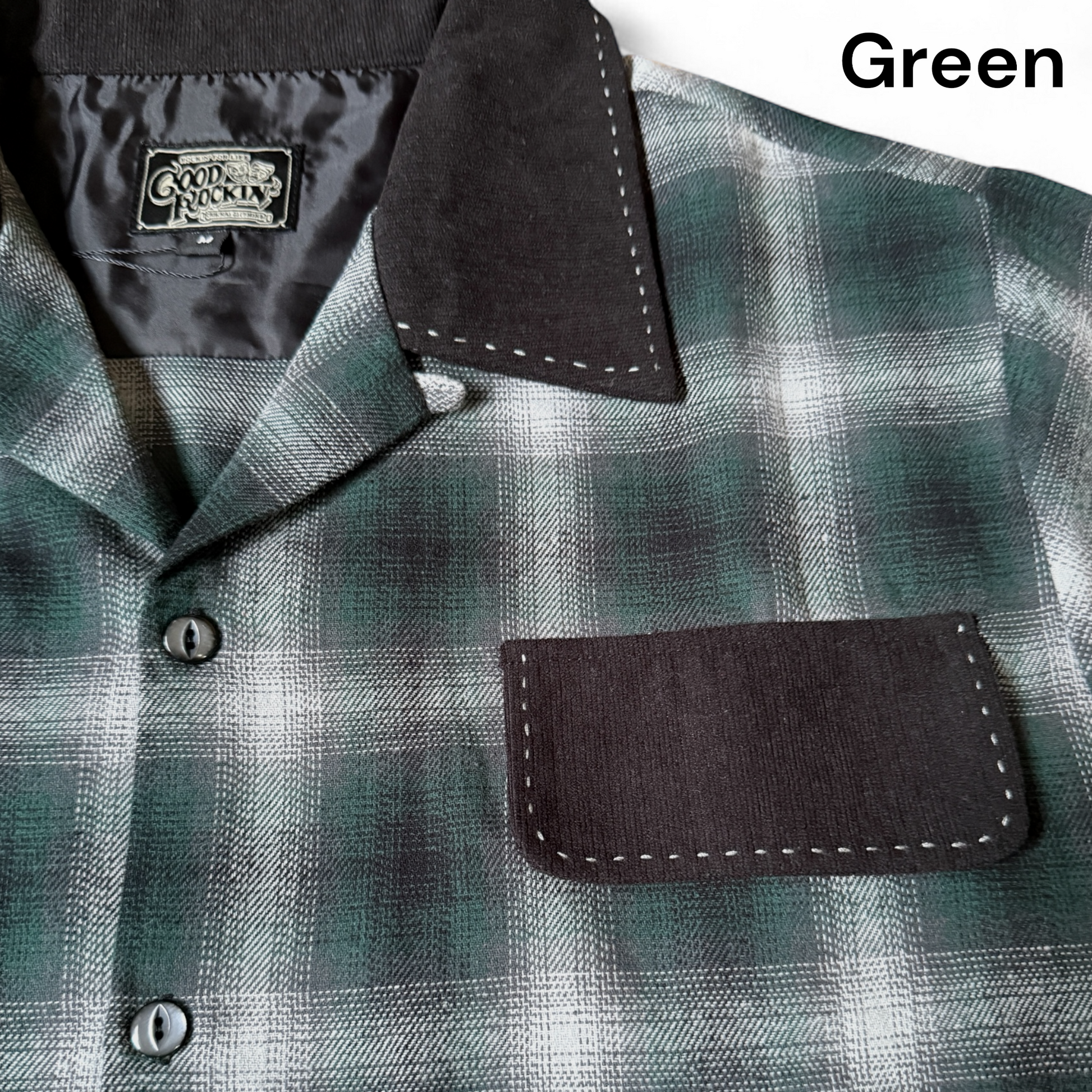 古き良き時代1950年代のアメリカで人気を集めたオンブレチェック柄をメインに使用したオープンカラーシャツです。デニムやチノパン等と相性の良い定番のアメカジアイテムですが、衿とフラップ部分に黒無地のコーデュロイ生地を使用する事によりクールなロッキンスタイルに。更にヴィンテージスタイルを意識し、衿とフラップにハンドステッチ加工を施しました。厚手過ぎず柔らかな着心地の生地は、レッド系、ブラック系、グリーン系の3色展開です。