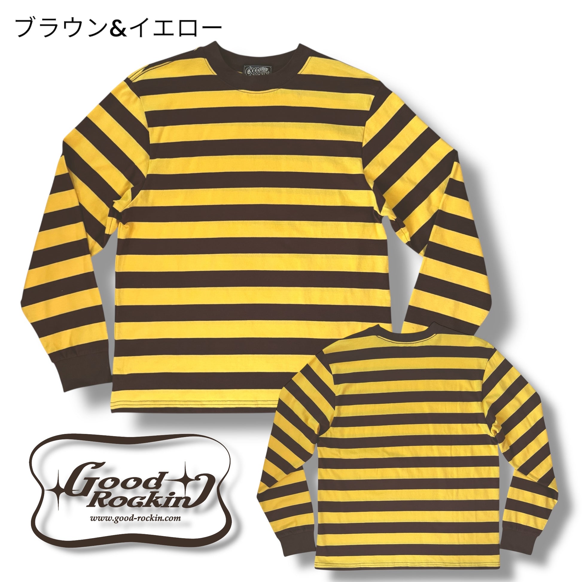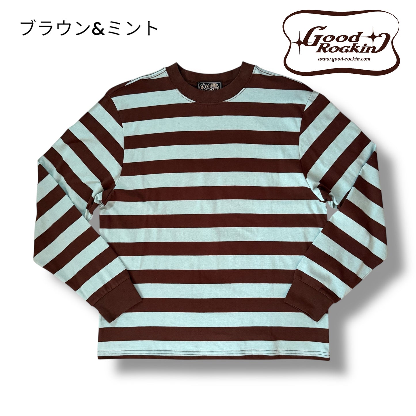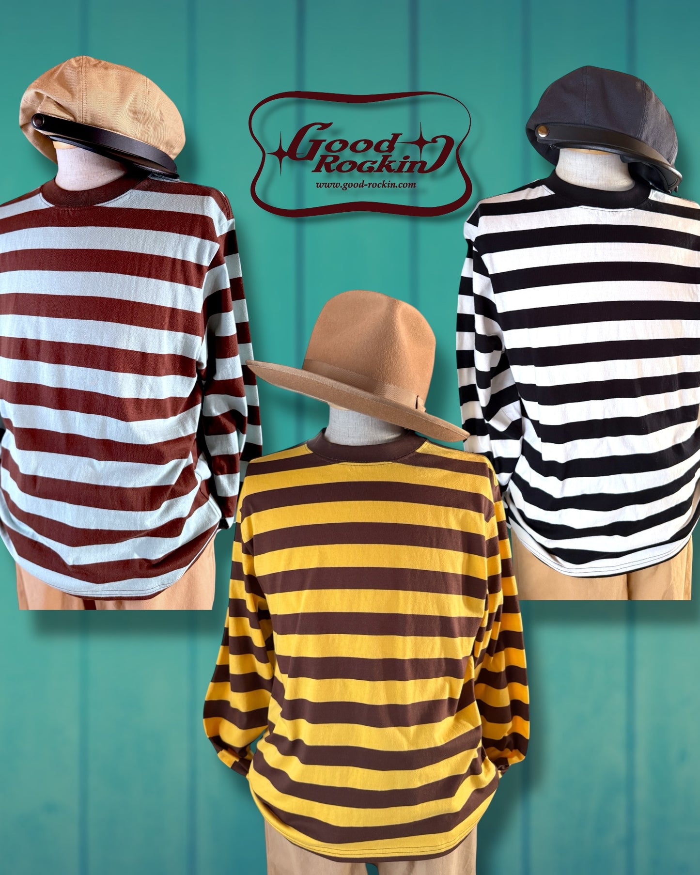 大人のロッキンスタイルの定番アイテムをオリジナルカラーと型に拘り制作したボーダー長袖Tシャツです。 太いリブ仕様は一枚でも様になりますが、レザージャケットやブルゾンのインナーにビシッと決まります。 メンズS、M、L、XLの4サイズ、絶妙なカラーがヴィンテージスタイルにも好相性のブラウン&イエロー、ブラウン&ミントとロックスタイルの定番ブラック&ホワイトの3色ストライプ。
