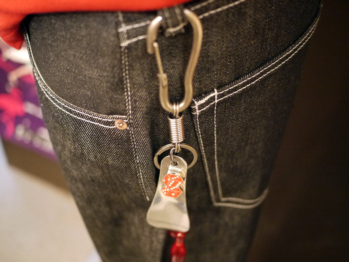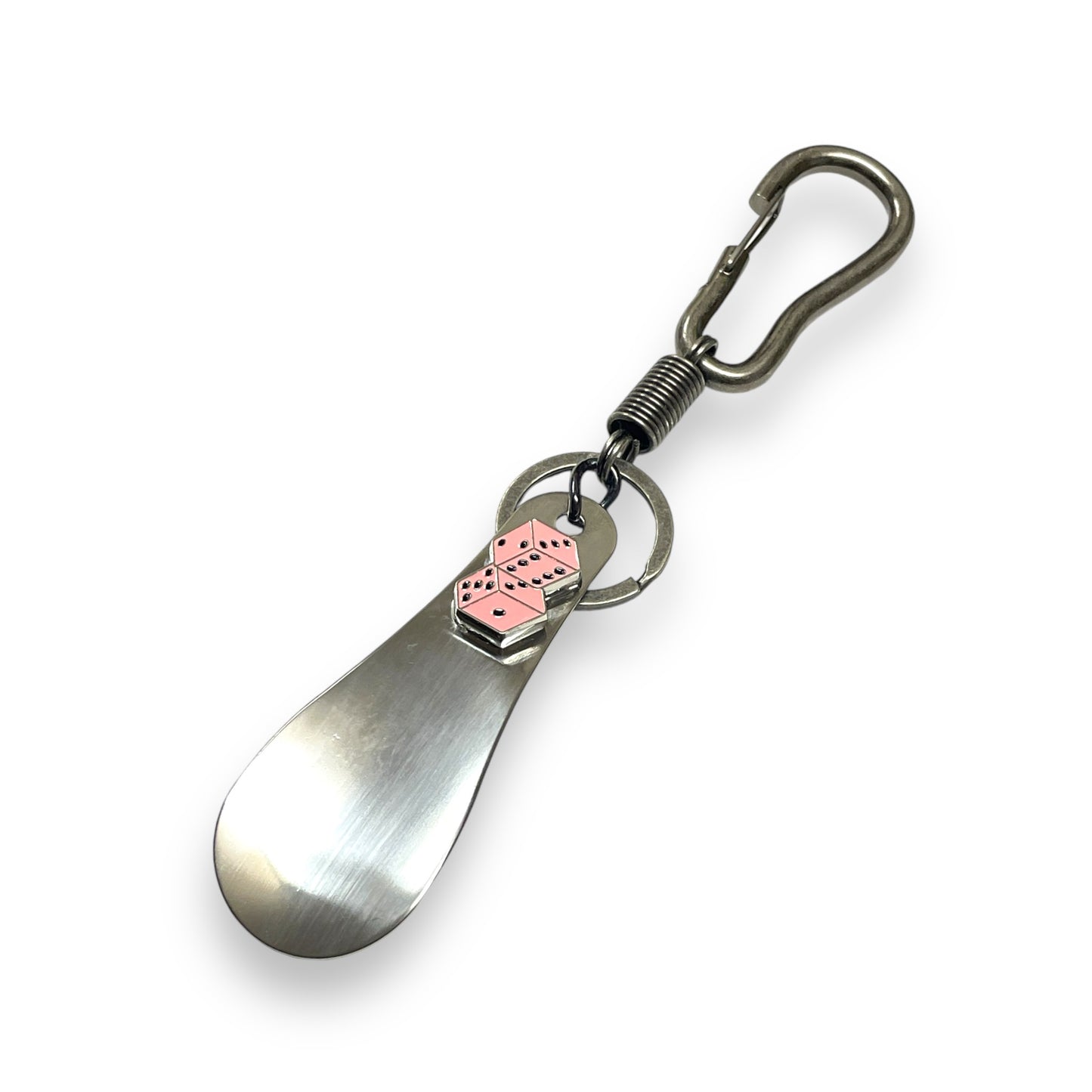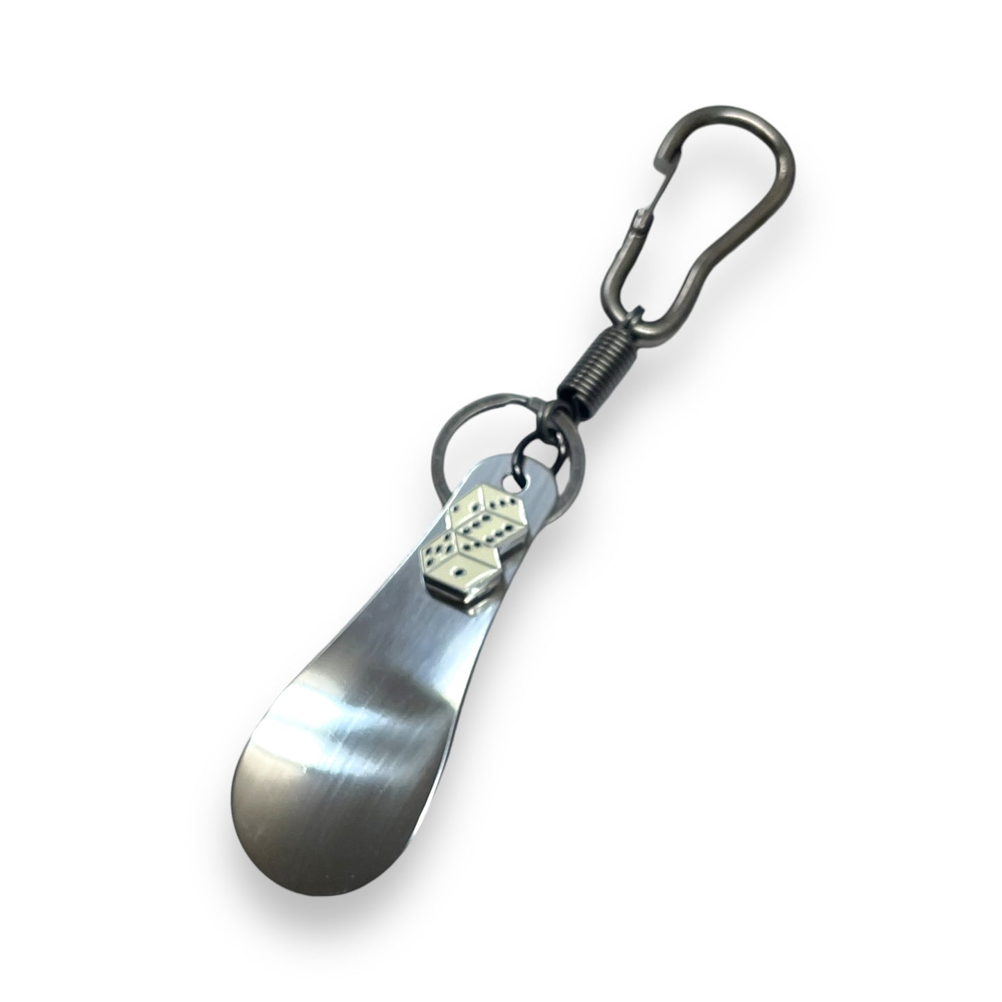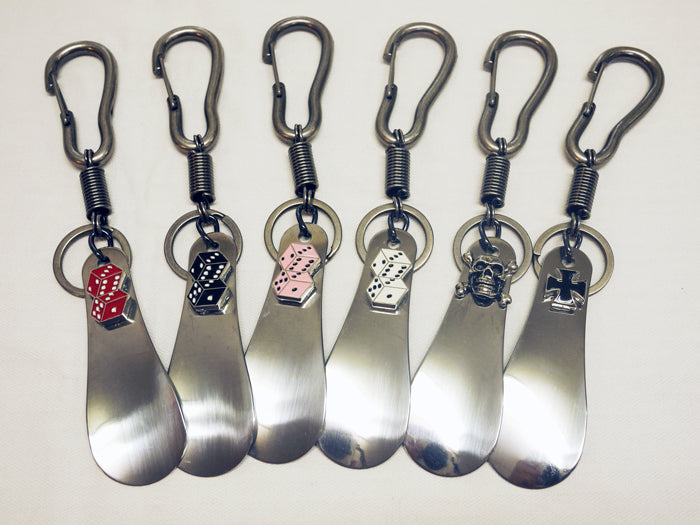 ダイス、スカル、アイアンクロスなどのロッキンモチーフが付いたメタル製の靴ベラ型キーホルダーです。