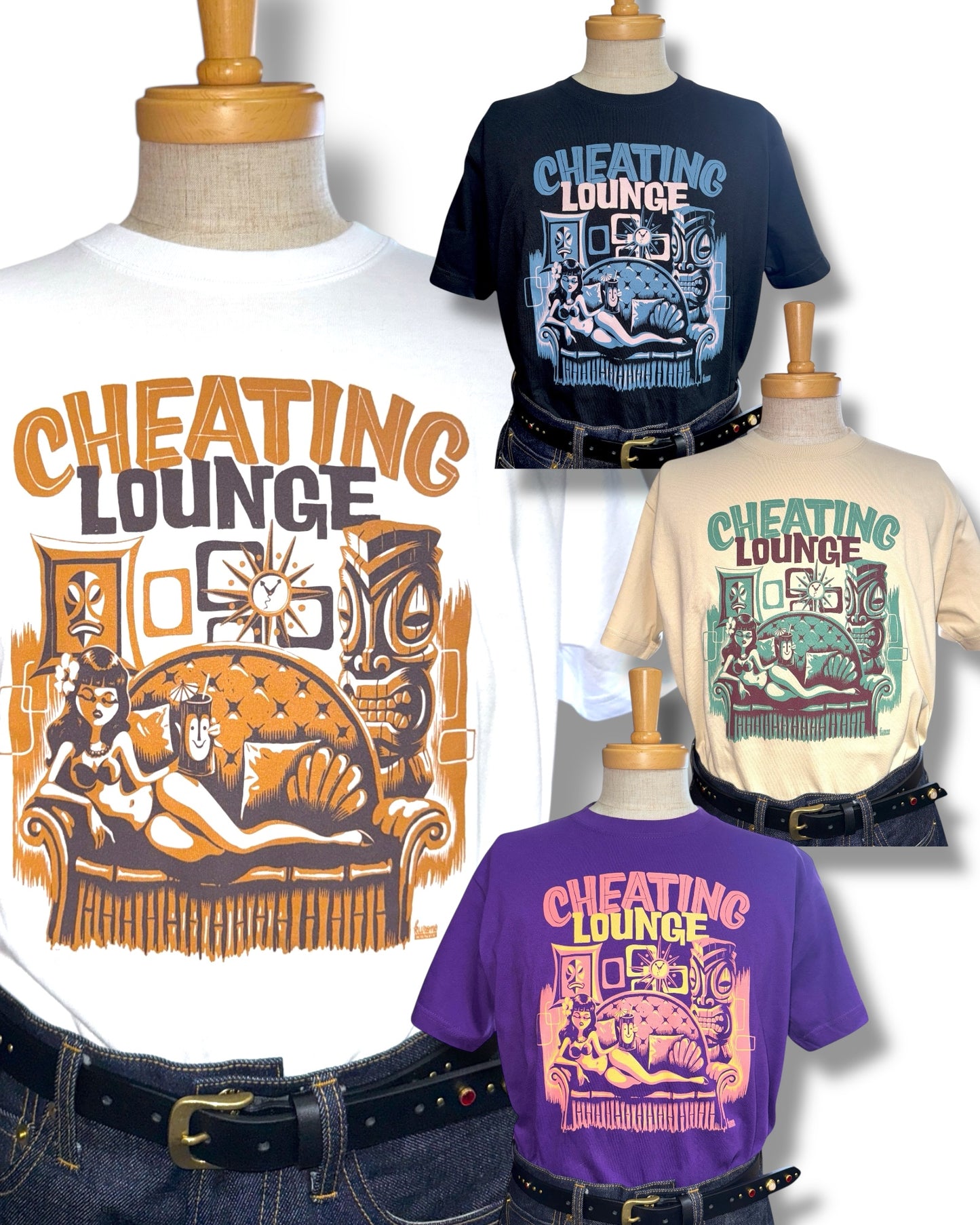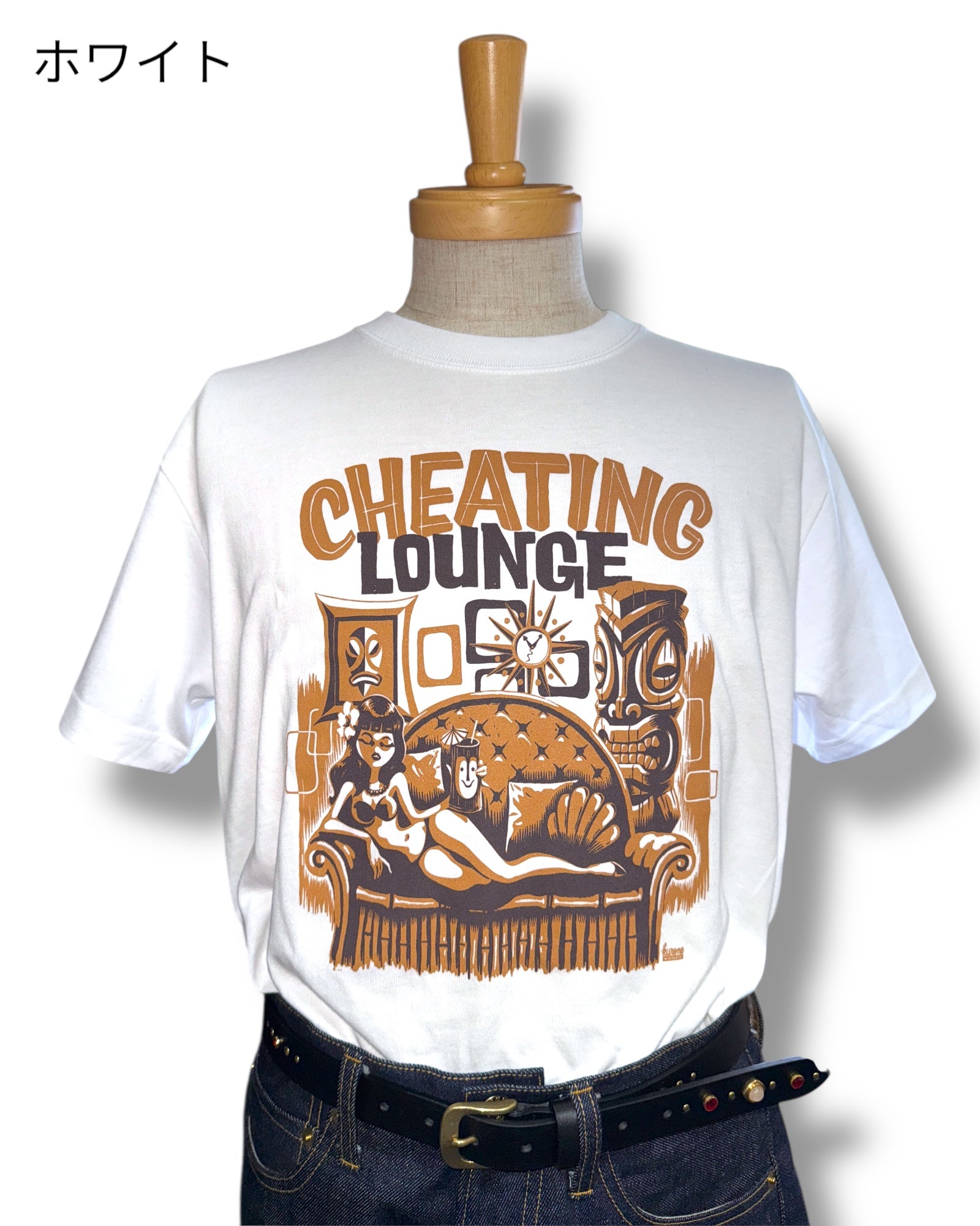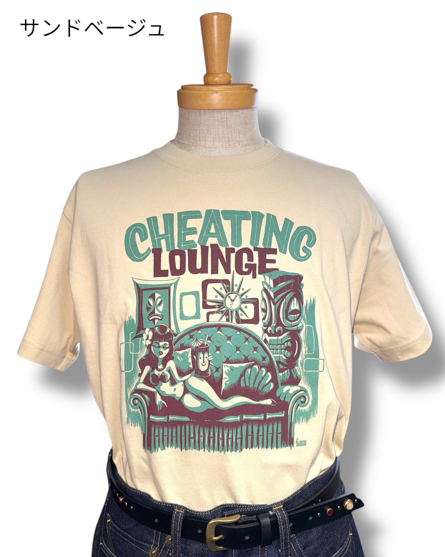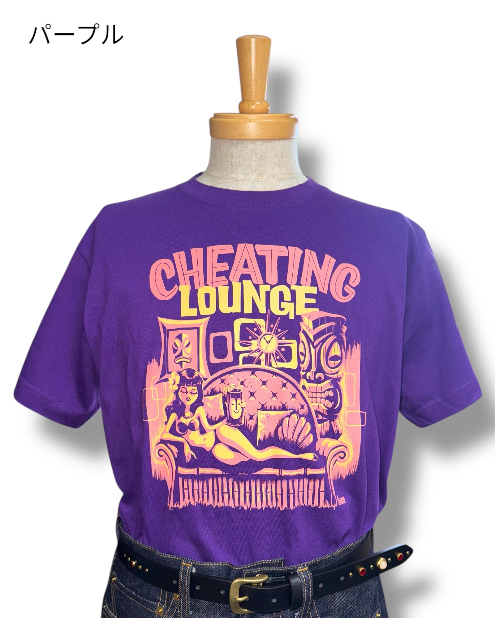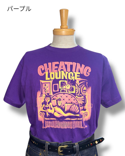 レトロなエキゾチックの魅力をチーティングラウンジのコンセプトに基づき表現した一枚です。グッドロッキンのアートワークも数多く手掛け、国内外で活躍中のアーティスト「Kurono」とのコラボ作品でもあります。サイズはレディースM、LとメンズS、M、L、XLの6サイズ展開、カラーホワイト、ブラック、サンドベージュ、パープルの4色展開です。