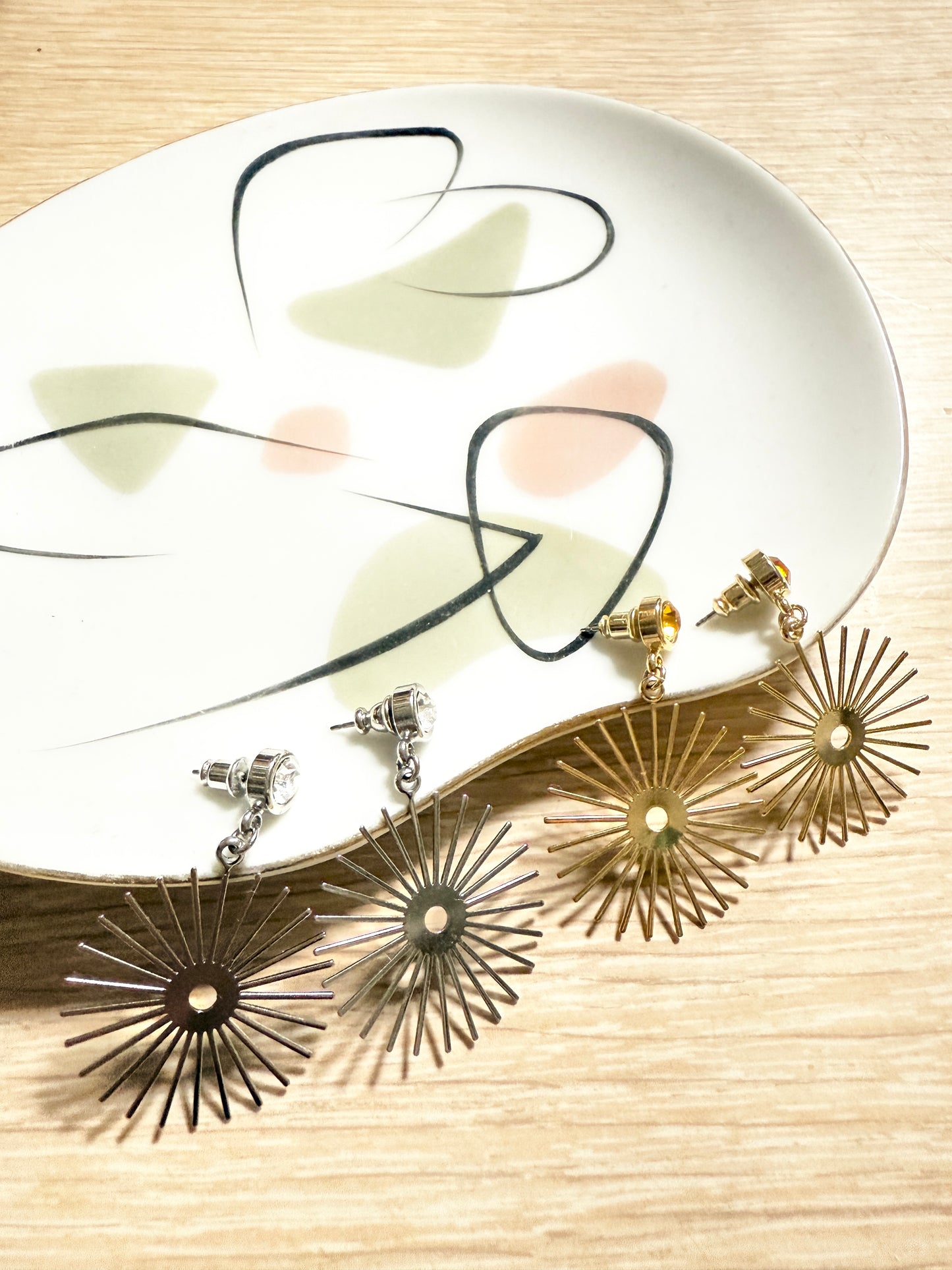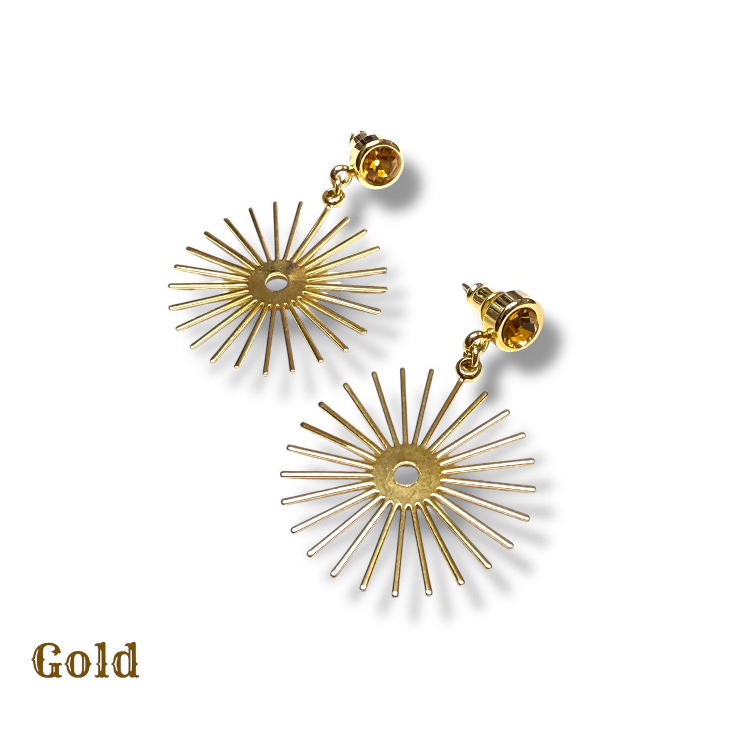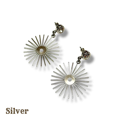 グッドロッキンxアメタルコラボレーションジュエリーの新作は、ミッドセンチュリースタイルのモビールの様にサンバーストモチーフが耳元で揺れるクールな大人のスイングピアスです。シンプルなブラス(真鍮)をベースにシルバーとゴールドのメッキを施し、シルバーにはクリア、ゴールドにはトパーズのラインストーンをセットしました。ボックス付きになりますのでギフトにもお勧めです。